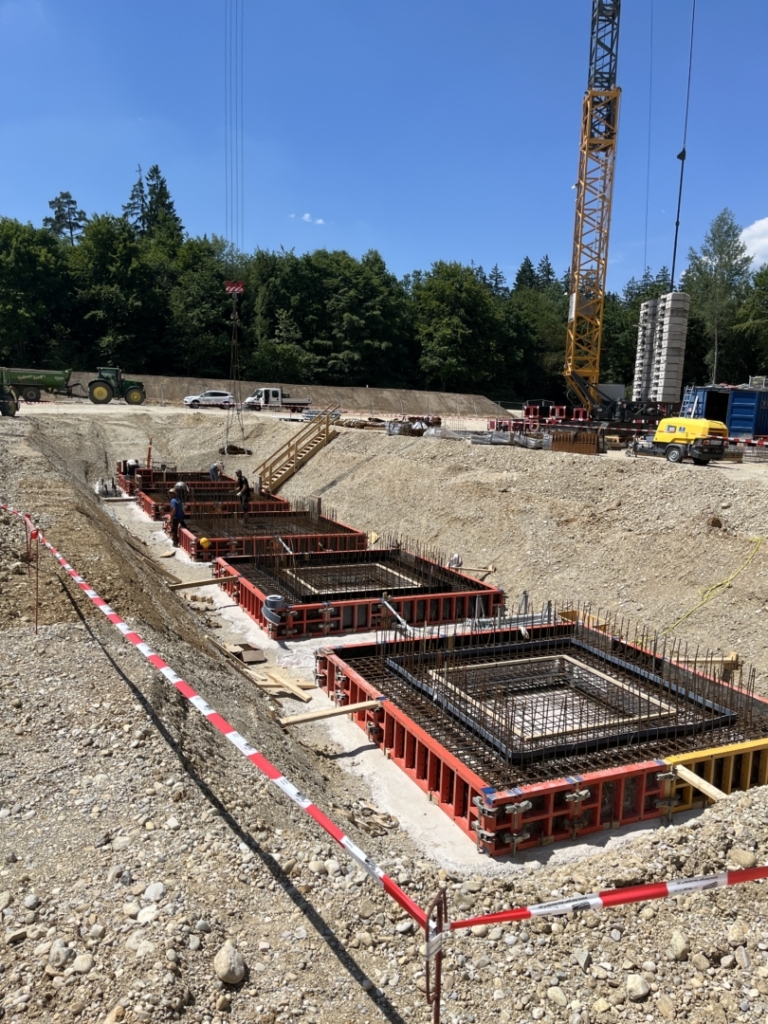 Die Grube für die Entwässerungsschächte ist ausgehoben und die Schalungsarbeiten für die Bohrkeller starten.